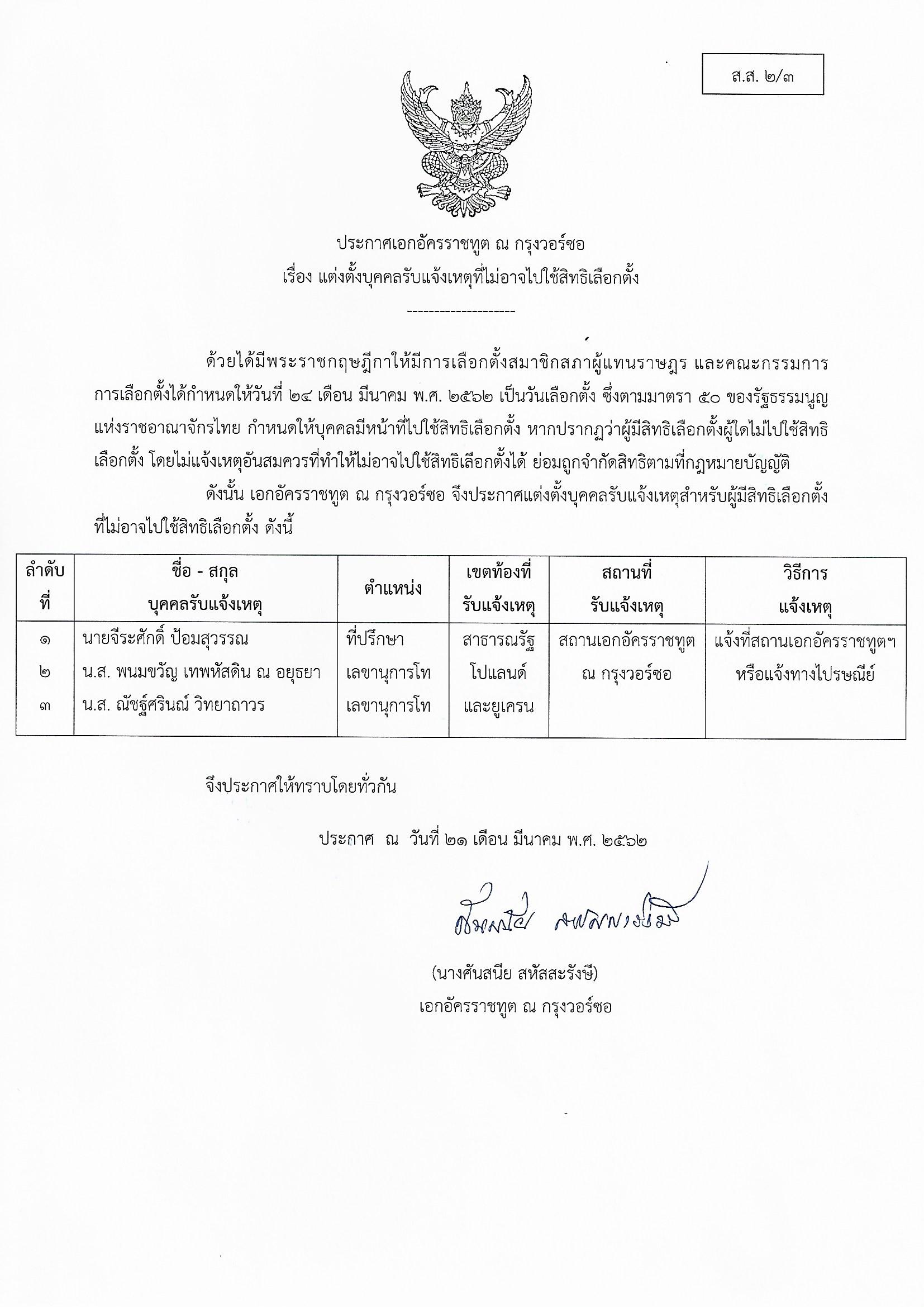 สำหรับชาวไทยในโปแลนด์ ที่พลาดโอกาสในการลงทะเบียนขอใช้สิทธิเลือกตั้ง หรือท่านที่ลงทะเบียนเรียบร้อยแล้ว แต่ไม่ได้ใช้สิทธิลงคะแนนเลือกตั้งครั้งนี้ สามารถแจ้งเหตุที่ไม่อาจไปใช้สิทธิเลือกตั้งได้ 2 ทางด้วยกันคือ