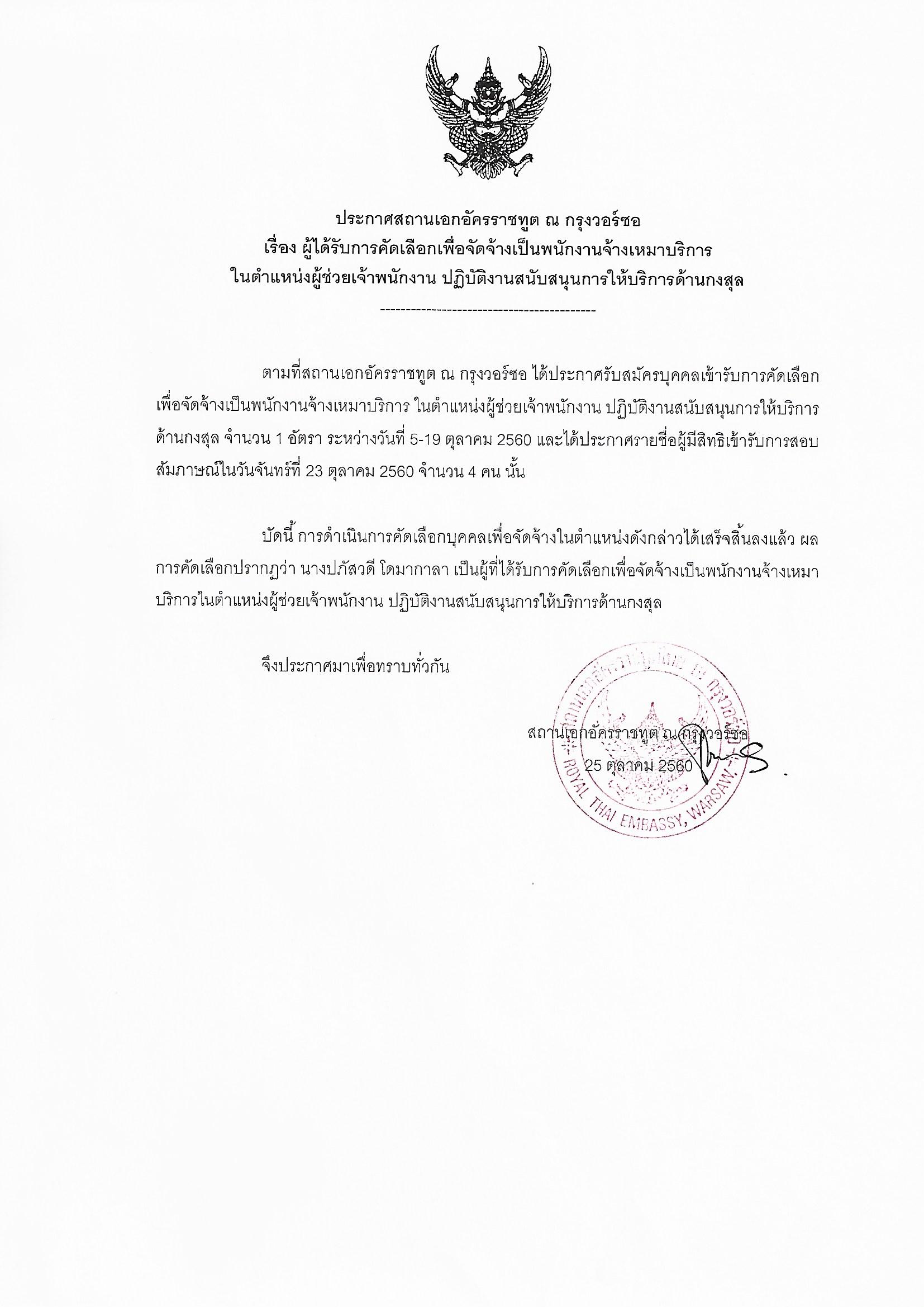 เรื่อง ผู้ได้รับการคัดเลือกเพื่อจัดจ้างเป็นพนักงานจ้างเหมาบริการในตำแหน่งผู้ช่วยเจ้าพนักงาน ปฎิบัติงานสนับสนุนการให้บริการด้านกงสุล