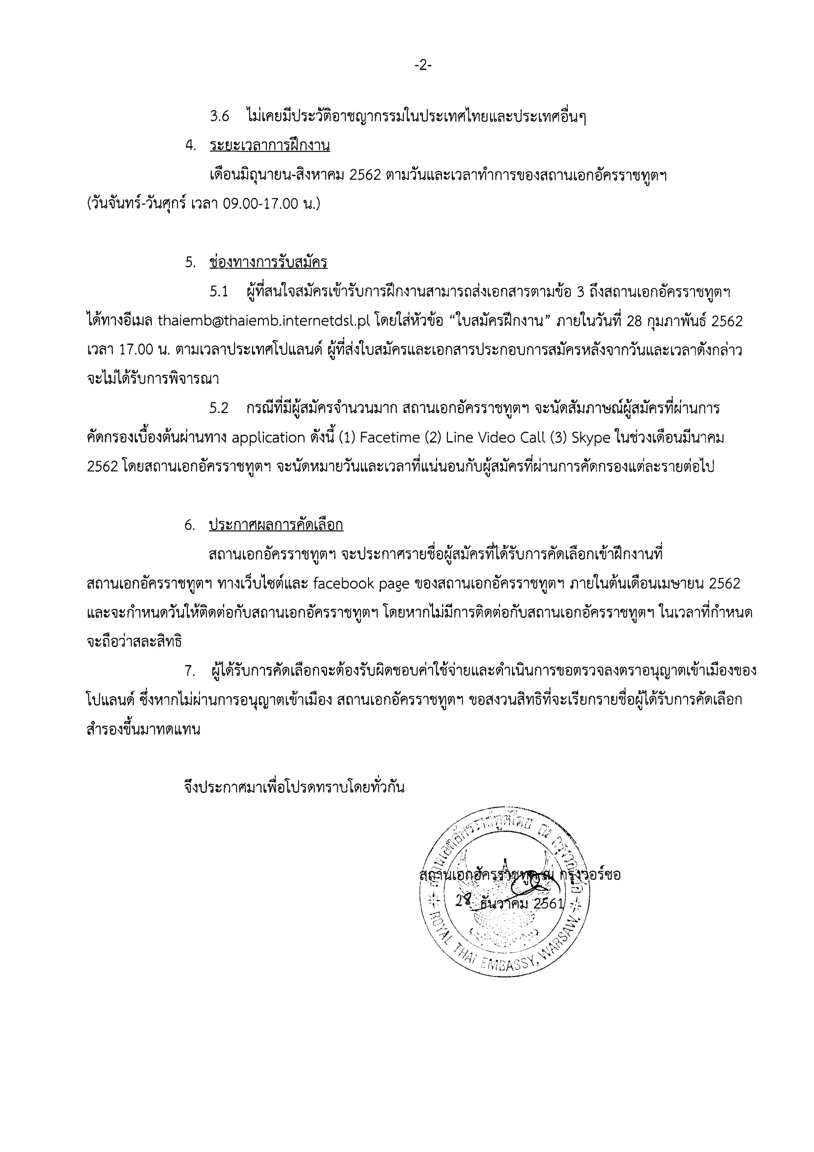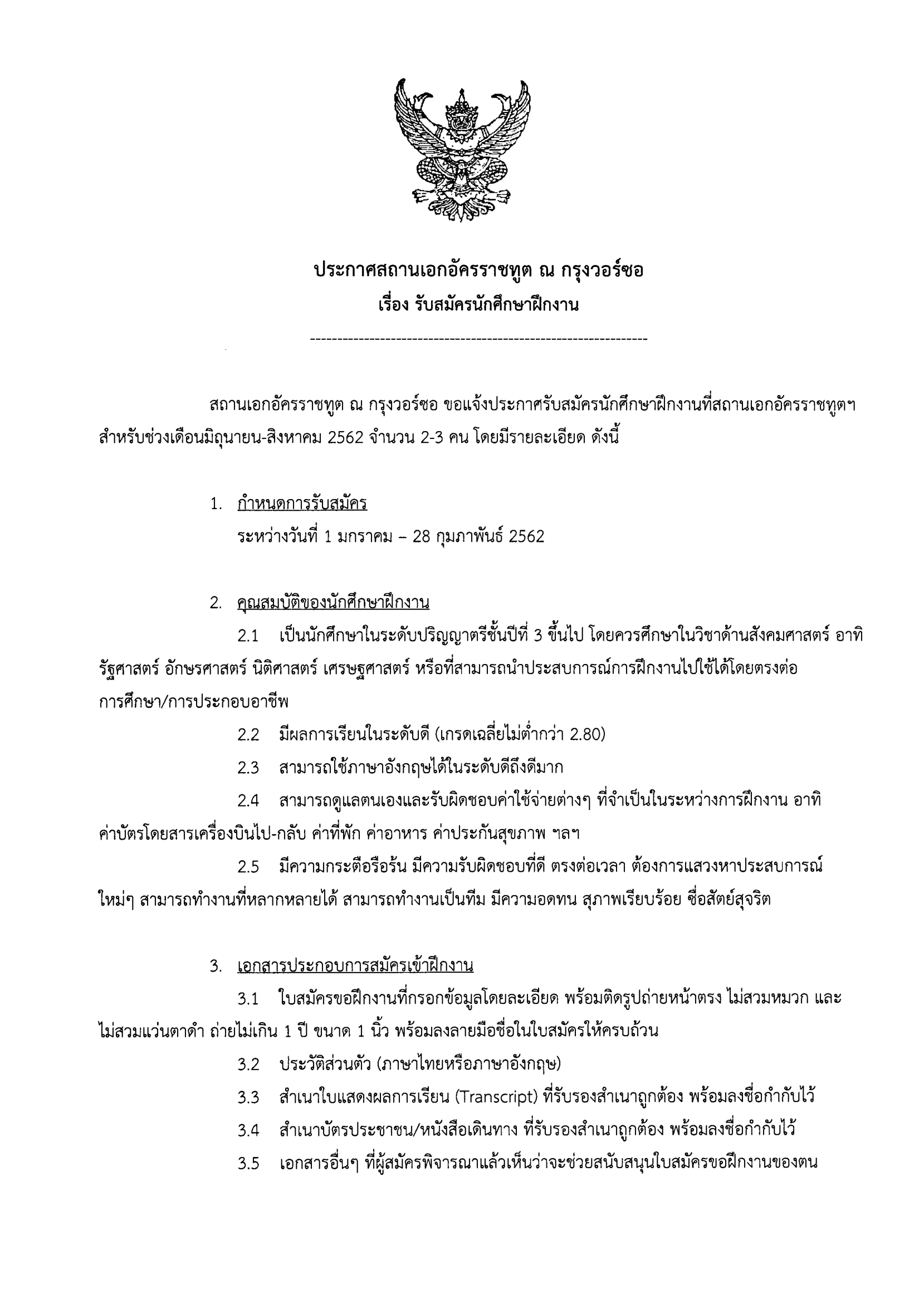 ประกาศ รับสมัครนักศึกษาฝึกงานที่สถานเอกอัครราชทูตฯ สำหรับช่วงเดือน มิถุนายน - สิงหาคม 2562