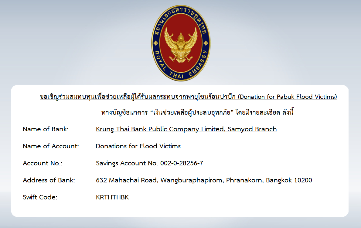 ขอเชิญร่วมสมทบทุนเพื่อช่วยเหลือผู้ได้รับผลกระทบจากพายุโซนร้อนปาบึก (Donation for Pabuk Flood Victims)